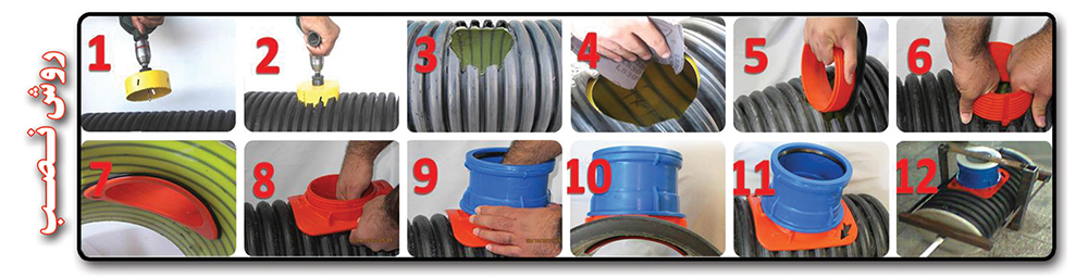 فـرو رفتن انشعابگیـر به  داخل شبکه فاضلاب. (همچنین طراحی فلش بر روی یقه انشعابگیر که نشـانه گـر جهت صحیح مونتاژ برای نصابانِ غیر